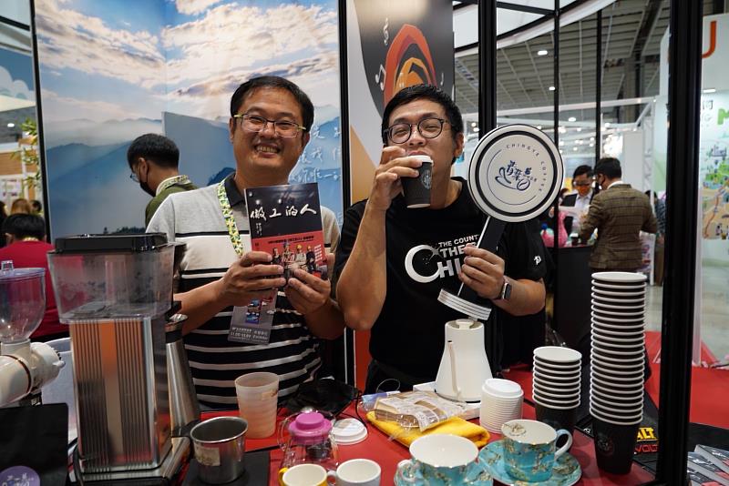 文觀局表示,第一天參展的咖啡業者是青葉咖啡莊園,今年剛獲阿里山莊園咖啡精英交流賽水洗組特等獎,主人葉世遠精心現沖,展館瀰漫陣陣香氣,讓林立青捨不得離開,林立青還親自跟葉世遠學煮咖啡,煮出的咖啡葉世遠打「99分」,林立青大讚,這咖啡真好喝,酸中帶果香。