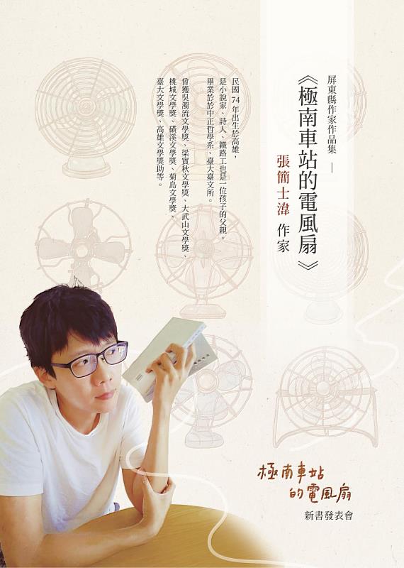 (中央社訊息服務20211108 11:57:20)新生代作家張簡士湋,參與109年屏東縣作家作品集寫作計畫徵集,在評比中脫穎而出,在屏東縣政府文化處的支持之下,出版屏東縣作家作品集《極南車站的電風扇》,並在11月13日下午2時於「南國青鳥」舉辦一場新書發表會,歡迎民眾共襄盛舉。