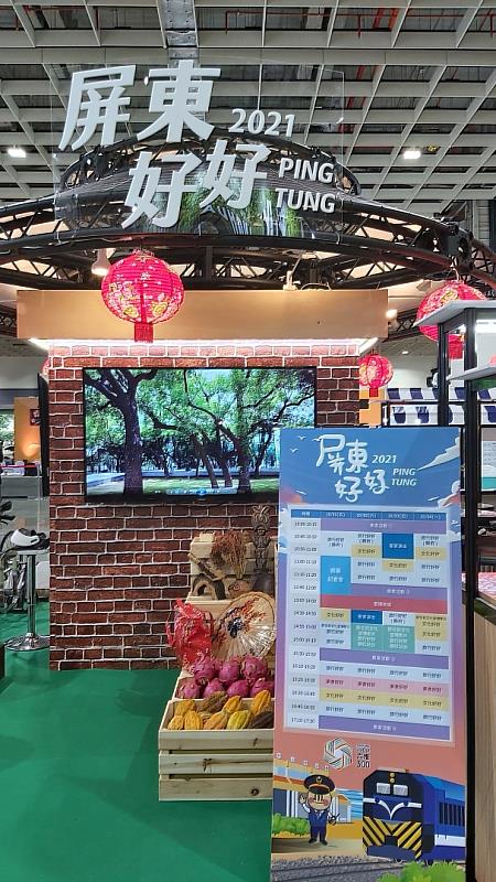 (中央社訊息服務20211109 11:26:20)2021年ITF台北國際旅展於11月8日圓滿閉幕,屏東館特以「客家六堆300年慶典」為主題,以象徵團結合作的傘架為聚落景觀搭設而成,詮釋著南部客家文化永續繁衍的意涵;視覺牆以蘭花蕨鐵馬段波斯菊花海、大津瀑布、霧台櫻花與大尖山串聯展示屏東熱門觀光旅遊景點,舞台以展示屏東特色的當季水果、原民藝術品與客家油紙傘牆的實體裝置,讓觀展民眾能有親臨屏東的臨場感,屏東縣府交通旅遊處表示,屏東縣這次參展獲獎相信能夠加深民眾的印象,並提高到屏東旅遊的意願。