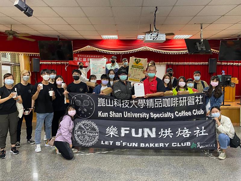 (中央社訊息服務20211118 13:34:21)崑山科技大學餐飲管理及廚藝系專業社團「樂fun烘焙社」、「精品咖啡社」攜手合作,11月16日上午特別帶著自製的點心及飲品,前往永康區東灣里活動中心,為社區長輩奉上可口的甜點與飲料,並與長輩同樂,溫馨度過暖冬。