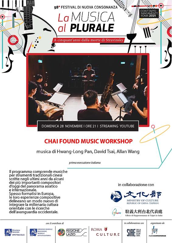 (中央社訊息服務20211124 09:51:08)文化部駐義大利代表處文化組攜手臺灣知名國寶級作曲家潘皇龍教授,與臺灣絲竹樂團「采風樂坊」,一同前進義大利第58屆Nuova Consonanza國際現代音樂節(58° Festival di Nuova Consonanza)演出,將於11月25日起至12月11日線上推出「福爾摩沙現代音樂專題」節目,帶來一系列包含音樂演奏會、專業研討會及交流工作坊等豐富多元活動,在疫情期間以傳統絲竹樂器與西方音樂交融後所展現獨特的東方魅力之音樂溫暖義大利聽眾。