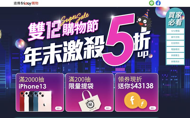 (中央社訊息服務20211208 16:04:09)本周日就逢雙12,遠傳friDay購物決定提前回饋消費者,全商品即起下殺最低1.2折,上百款精選商品包含奇哥汽車安全座椅、雅詩蘭黛真愛乳霜組、義大利不沾鍋組等全都半價以下回饋,更有眾多遠傳friDay購物獨家促銷商品,從10日起還有限時3天大加碼,家電、電腦、電玩等輸入折扣碼最高再折1,212元,站上愛買、city’super旗艦館也加碼限時滿千送百、特惠商品買一送一,全站消費滿額還有機會抽中iPhone 13大禮,堪稱今年最後搶便宜機會!
