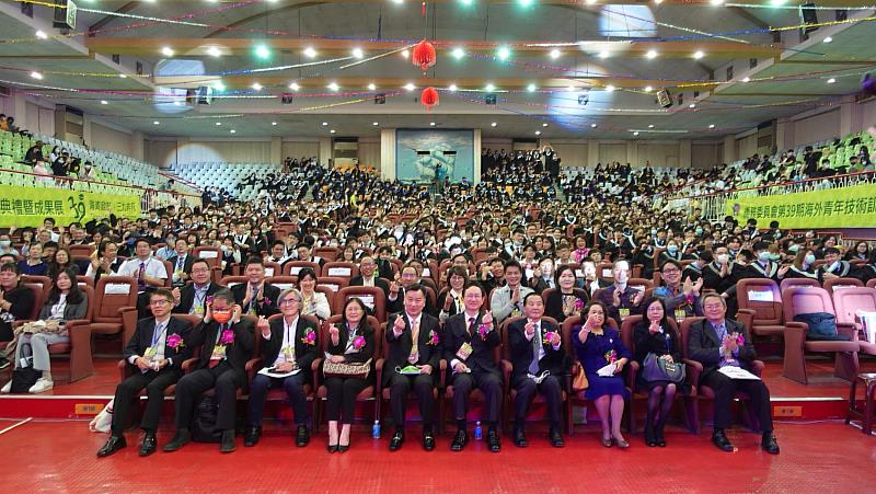 僑委會委員長童振源特地出席典禮與畢業生互動並致詞,他先恭喜畢業的同學們,經過2年認真、努力的學習與訓練後,終於學有所成,當天在各位師長、貴賓及學弟妹的見證下,展現出最精彩的畢業成果,令人相當欣慰。因此,他也相當感謝崑山科大從開場表演安排十鼓擊樂團帶來的精采演出,以及盛大的會場展佈,皆可看出團隊的精心籌劃,另感謝在場的12所海青班承辦學校,共同促成今天的成果與名聲。