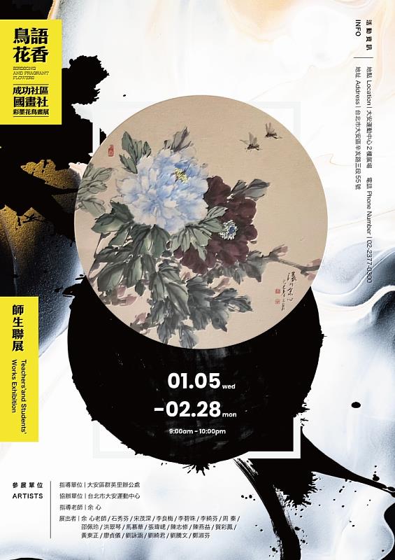此次公益畫展主題為【鳥語花香】,展出的作品均為大安區群英里成功社區國畫社師生們長期磨練技法的彩墨作品,每幅花鳥彩墨畫都是師生們嘔心瀝血之作,希望讓大家在運動中心內,除了運動讓身體健康之外,也能藉由欣賞中華文化的書畫作品,讓心靈健康美麗。防疫心生活公益畫展-鳥語花香彩墨花鳥畫展展期自即日起至111年2月28日止,歡迎有興趣的朋友們入館來欣賞畫作,我們將持續帶入更多不同的藝文作品,展現運動場館的多元性與豐富性。
