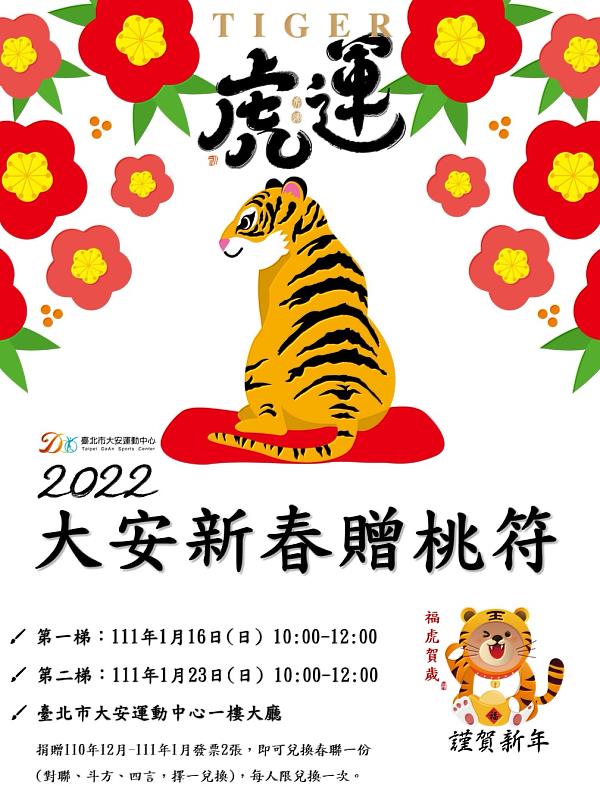 (中央社訊息服務20220107 11:07:40)喜迎虎年、福虎生豐、虎氣沖天!大安運動中心將在111年辦理兩梯次的贈春聯公益活動,分別在1月16日(日)及1月23日(日)上午十點於大安運動中心一樓大廳隆重登場!