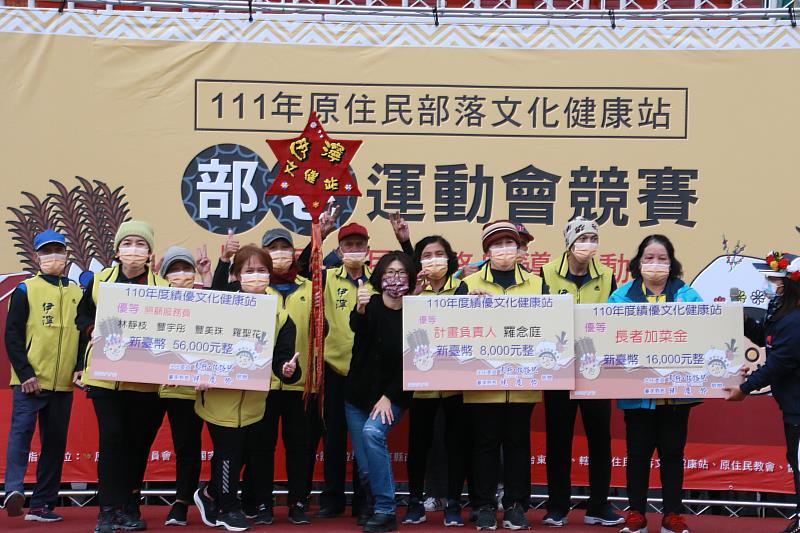 (中央社訊息服務20220112 17:24:14)為了增加部落長者外出活動的機會,臺東縣政府今(12)日舉辦部落文化健康站「部老運動會」,各鄉鎮共3,000多位長者前來同歡,展現臺東原民部落長者的熱情與活力,並由縣長饒慶鈴為去(110)年績優的24個文健站頒發總金額100萬元獎金,原民會主委夷將‧拔路兒Icyang.Parod、立委陳瑩等到場關心。饒慶鈴表示,縣府設計體適能、懷舊等不同課程及活動,增進部落長輩身心靈健康,另特別為績優文健站頒獎,感謝照服員等工作夥伴的付出,讓文健站成為長輩的第二個家,未來也即將增加更多站點,服務更多長者。