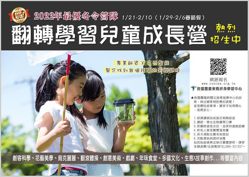 (中央社訊息服務20220119 11:59:38)臺東縣救國團推出口碑營隊「翻轉學習兒童成長營」,授課講師皆完成施打兩劑疫苗,並落實疫政策,讓孩子玩得開心、爸媽安心;營隊師資陣容堅強,邀請三沃創意有限公司(創客平台)-許琳翊老師、花藝文創-花劉昱麟老師、種子文創藝術-瓦賴工作室、丹尼皮革工作室-洪成老師、救國團烘焙專任師資-侯淑卿老師、救國團烏克麗麗、空靈鼓-裴匡右老師…等專業師資,營隊課程融入元智能,特色內容有美感教育、小兵日記迷彩體驗、創客科學、年味食堂、大自然蒐藏家、烏克麗麗、翻滾體操、戲劇、MV舞蹈、花藝美學堂、多國文化探索…等,幫您找到每個孩子的天賦翅膀,讓孩子體會到生活中處處是學問,自己解決問題並啟發多元興趣,在臺東這片得天獨厚的土地,盡情享受自然、人文與藝術;歡迎國小學童報名參加,報名地點:臺東市博愛路425號(洽詢電話-089-331327)