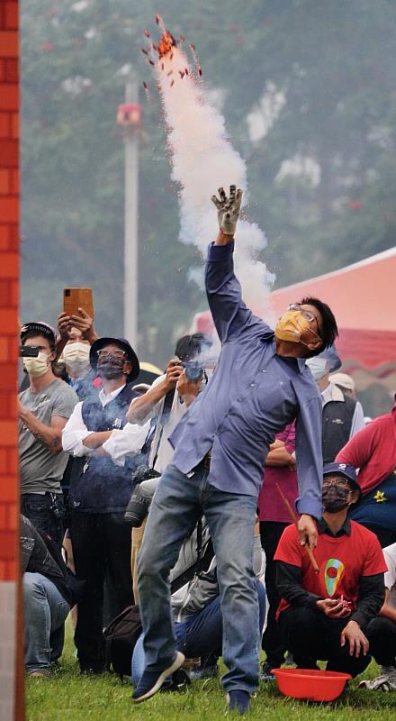 今年攻炮城用的排炮,是客家獅老師傅-劉文雄等團隊他們一個一個串起來的,過去傳統的攻炮是一顆一顆的炮,現代的版本則是串起來的排炮。