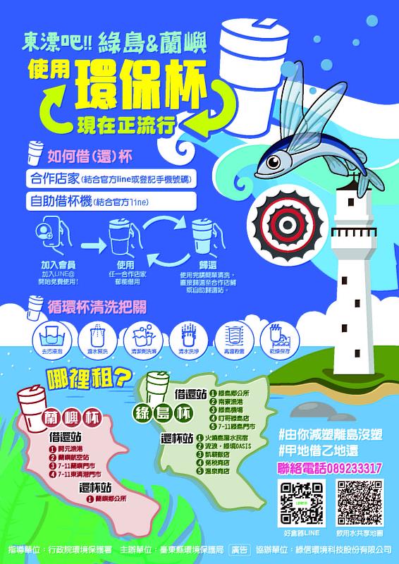 環保局指出,依據臺東觀光旅遊網110年統計,蘭嶼及綠島雖受到疫情的影響, 仍有超過23萬名遊客登島旅遊,為了減少旅遊過程中產生的一次性飲料杯垃圾,環保局設計並打造蘭嶼及綠島2款離島專用環保杯,並試辦環保杯租賃活動,在試辦期間,提供旅客及島民租賃使用,民眾可持離島專屬環保杯至店家、便利超商購買飲品,也可以透過環保署奉茶行動APP到島上的加水站使用,打造屬於蘭嶼及綠島特色的減廢新生活。