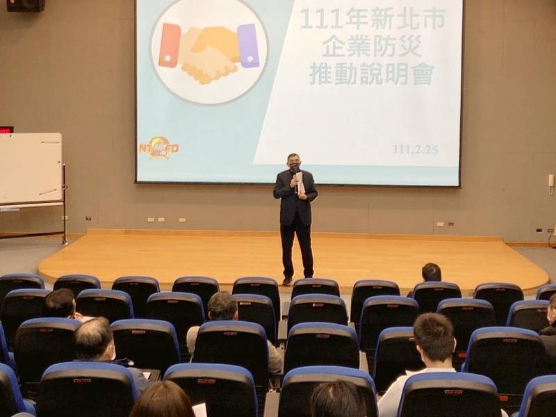 (中央社訊息服務20220225 17:35:59)新北市政府於111年2月25日下午2時於市府大樓507會議室辦理「新北市111年企業防災推動說明會」,由新北市政府消防局黃德清局長主持,透過說明會邀請企業參與防災合作,現場有上百間企業出席,反應熱烈。