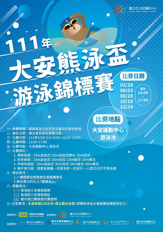 大安熊泳盃游泳錦標賽將在6/3、8/28、10/10、12/24持續辦理;孩子們想了解自己的游泳能力,可再3/26、4/30、5/28、7/30、9/26、1/26由大安運動中心舉辦的游泳能力檢定,相關的資訊請關注大安運動中心的官網及臉書粉絲專頁訊息。