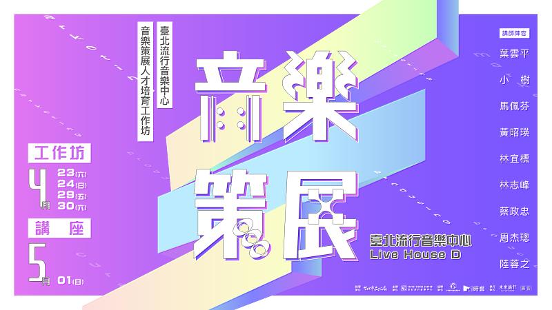 (中央社訊息服務20220303 14:50:07)臺北流行音樂中心「音樂策展人才培育工作坊」報名正式開跑!流行音樂具備時代特性,乘載著當下社會思維,「音樂策展人才培育工作坊」結合流行音樂與策展思維,邀請流行音樂、聲音及表演藝術、視覺藝術、文化場域之工作人員、創作者或學生組隊提案參與,發揮所長及創意,敘述對音樂的想像。工作坊將於4/23、4/24、4/29、4/30、5/1舉辦,透過策展、製作、行銷三大面向延伸實務課程,更於5/1舉辦國際講座案例分享,透過音樂與展覽的交互作用,帶領參與者共同探討音樂策展的可能性。