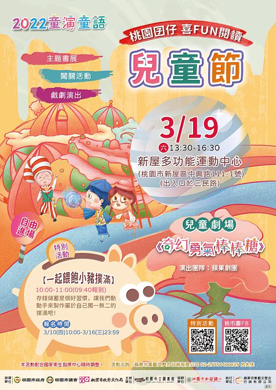 (中央社訊息服務20220309 09:49:04) 桃園市立圖書館「童演童語」嬰幼兒閱讀推廣活動,持續為親子帶來兼具遊樂、教育意義地活動。2022年第二場次的「童演童語」活動將於3月19日新屋區-新屋多功能運動中心隆重登場!搭配「桃園兒童藝術節」系列活動,邀請國內多元知名劇團「蘋果劇團」推出《奇幻勇氣棒棒糖》兒童劇,結合周邊富含古早味的闖關遊戲與特別活動,邀請大家一同來過歡樂兒童節!