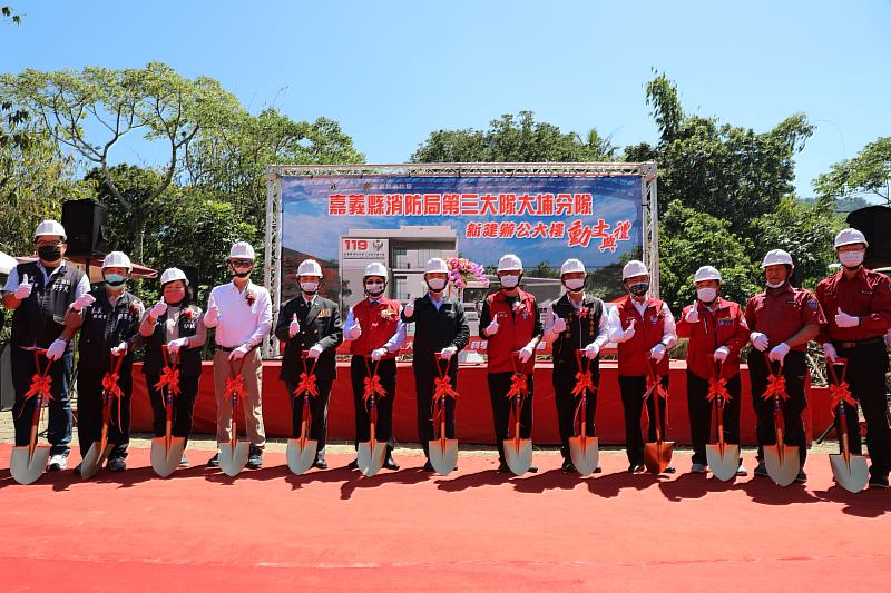 (中央社訊息服務20220310 15:08:30)位於偏遠山區的嘉義縣消防局第三大隊大埔分隊,10日由縣長翁章梁、議長張明達、大埔鄉長吳明勳、消防局長呂清海等人主持新建辦公大樓動土。這楝造價4152.6萬元、4層樓的新建廳舍,預定112年完工,消防隊「起新厝」,鄉親都很高興,不但大幅提升隊員備勤、工作環境與消防車出入安全性,鄉親的生命財產安全也更有保障了。