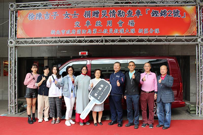 (中央社訊息服務20220310 17:15:40)徐公鏗鏛老先生為耕讀傳家世居於新莊瓊林的徐氏大家族,生平為人寬厚,待人謙仁為懷,性格堅毅卓絕,行事沉穩慎重,造福鄉里貢獻社會.一生卓越事蹟與善行義舉不及備載,生前慈悲喜捨關懷孤苦默默行善,見孤苦老弱病殘默默資助皆不遺餘力,若有廟宇醫院等協建樂捐從不落人後!其膝下子女秉持著父親樂善好施風範,在事業騰達之際不忘繼承父親造福鄉里典範,徐公鏗鏛老先生三名子女(徐育才先生 徐育仁先生 徐育瑜女士)繼前(109)年捐贈給新莊分隊鏗鏛1號救護車後,去(110)年捐贈1000顆獨立式住宅警報器受惠給所有市民,今(111)年徐育才先生又再次以母親徐陳吉子的名義捐贈給新莊分隊鏗鏛2號災情勘查車1輛,特於捐贈前至新莊地藏庵過火,祈求救災出勤人車平安,並於3月10日假新莊分隊辦理交車啟用典禮,由義消總隊長蔣根煌議長代表受贈,現場除感謝徐育才先生的善舉;更希望透過此次災勘車捐贈,強化大新莊地區消防救災戰力,確保民眾公共安全。
