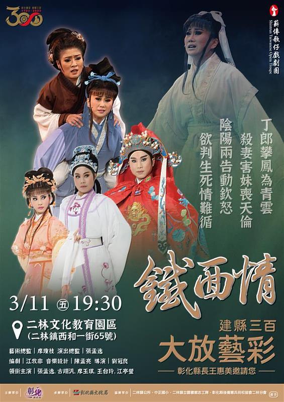 (中央社訊息服務20220311 14:09:23)彰化建縣即將邁入三百年,縣府規劃「建縣三百 大放藝彩~鄉鎮藝術巡演」,先前已辦理的五場活動,場場都是高朋滿座,獲得民眾熱烈迴響,本周一次推出兩場重頭戲,3月11日(星期五)「薪傳歌仔戲劇團」在二林文化教育園區、3月13日(星期日)「明華園日字戲劇團」在田中景崧文化教育園區,皆於晚間7時30分開演,免票入場,歡迎闔家蒞臨。