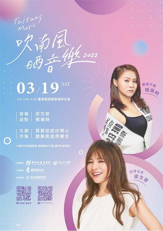 (中央社訊息服務20220316 11:58:00)臺東縣政府文化處舉辦多年的「浪漫療癒吹南風晒音樂」活動,今年首場音樂市集派對將於3月19日(六)下午3點登場,將邀請到巴冷公主梁文音、靈魂天籟楊蒨時2位美聲歌姬,我們與您相約在大家熟悉的藍晒圖廣場後方鐵道步廊(臺東故事館後方),歡迎鄉親朋友一起吹著南風、聽著音樂、逛著市集,度過歡樂悠閒的午後時光,並請落實防疫相關措施。
