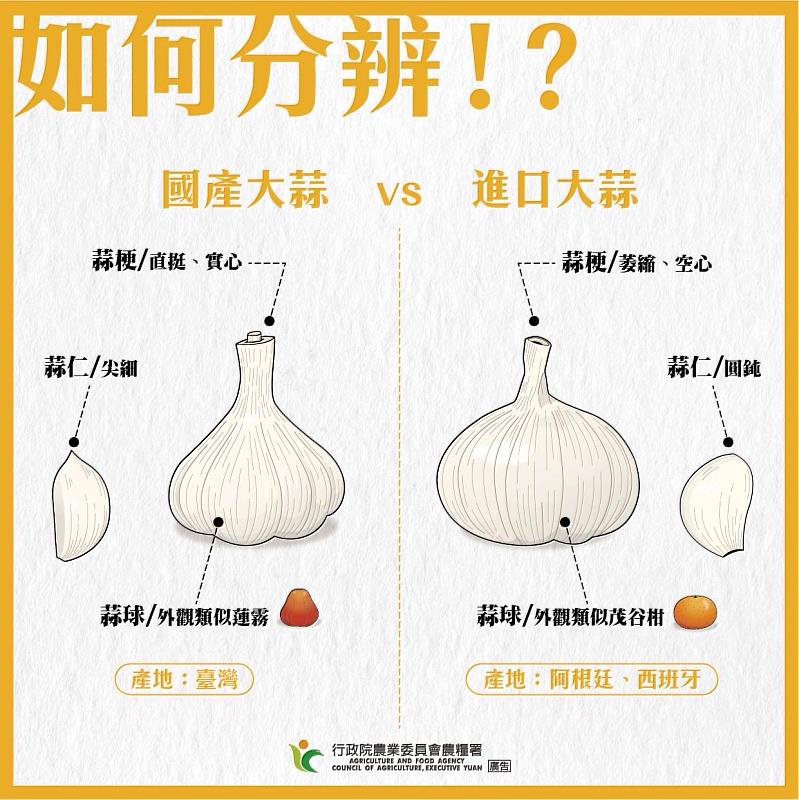 農糧署說明,國產大蒜風味辛辣,蒜球外型呈下寬上窄之吊鐘型,外觀似蓮霧,品質佳又耐貯放,消費者可趁鮮多加選購。另進口大蒜辛辣味不足,鮮度差,其蒜球外型呈扁圓型,外觀形似茂谷柑,且經過長程運輸,碳足跡高。該署為方便消費者選購國產大蒜,將輔導產地農民團體以1至2台斤小包裝供應各大賣場與連鎖超市,消費者可認明產銷履歷(TAP)、有機標章或外觀形狀,即可輕鬆選購國產大蒜,購買後直接將網袋置於通風處風乾保存,隨時享用在地新鮮嗆辣的臺灣大蒜好滋味。