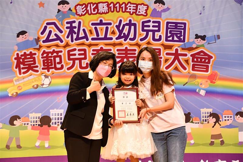 (中央社訊息服務20220325 15:29:55)彰化縣111年度公私立幼兒園模範兒童表揚大會,今(25)日上午在彰化演藝廳舉辦,彰化縣長王惠美與會頒獎,表揚268位模範兒童,其中代表員家非營利幼兒園的張定宥小朋友,善良體貼,爸爸在定宥小班時離世,乖巧懂事的定宥知道媽媽的辛勞,總在媽媽下班後甜甜地向媽媽說聲「媽媽辛苦了!」,平時也經常表現出要照顧媽媽的小大人模樣,希望能趕快長大照顧媽媽,讓媽媽倍感窩心,在學校的定宥自律認真,也會教導與協助同學,謙虛有禮貌,相當成熟懂事,是大家的好榜樣。王縣長祝福所有小朋友兒童節快樂,並恭賀得獎的小朋友是大家學習的榜樣,也勉勵大家認真學習、尊敬師長、友愛同學,在家孝順父母、願意與兄弟姊妹互相分享,成為有品德、認真懂事的好孩子。