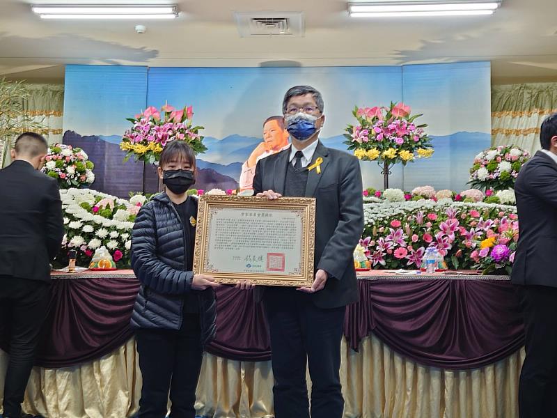 (中央社訊息服務20220404 09:20:59)音樂人邱晨的告別式3日在東勢舉行,客家委員會主任委員楊長鎮出席並頒贈「客家委員會一等客家事務專業獎章及證書」及褒揚狀,感謝邱晨留下諸多作品,以及客家文化傳承的貢獻。