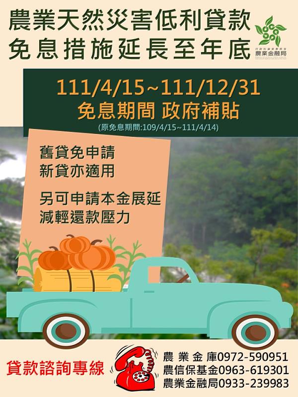 農委會農金局表示,111年1至2月雨害、低溫、寒流等天然災害因素,造成農業損失,受災地區分布北、中、南、東,區域廣泛,影響範圍大;另考量部分受災農漁民尚未完全回復疫情前之營農收益,復遭受天災侵襲,還款能力欠佳,為協助其辦理災後復耕、復養,減輕利息負擔,爰將天災貸款免息措施期間由原至111年4月14日止,延長至111年12月31日止,本次免息措施重點說明如下: