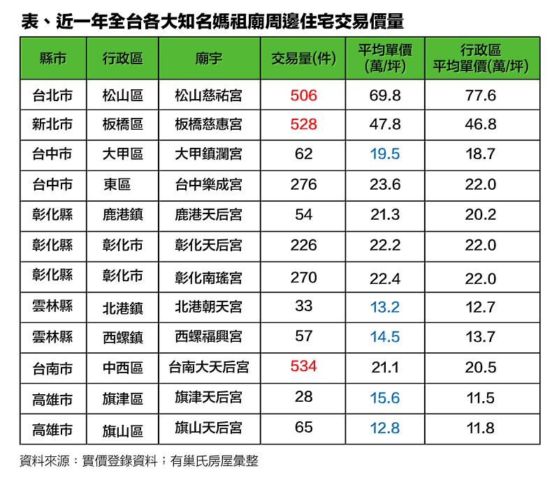 (中央社訊息服務20220408 14:54:02)一年一度的大甲鎮瀾宮媽祖遶境將在今(8)日晚間11點起駕,全台灣掀起「追女神」風潮!有巢氏房屋依據內政部實價登錄,盤點北、中、南12個具代表性的媽祖廟,觀察近一年周邊1公里內、屋齡2年以上的中古屋交易量及房價變化,發現各大媽祖廟周邊平均單價幾乎均高於行政區單價,打破宮廟被視為「嫌惡設施」、價格往往低於區域行情的迷思。