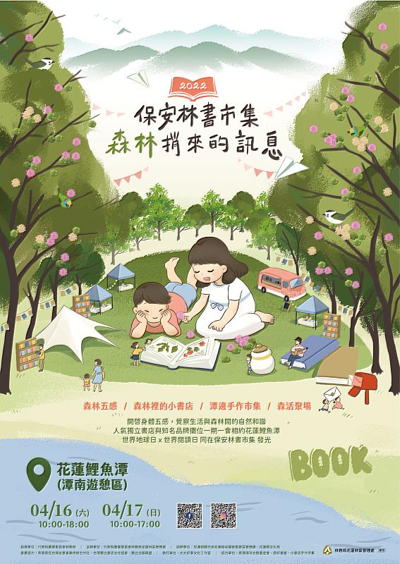 (中央社訊息服務20220411 15:52:10)東台灣最大、最具特色的書市集即將重磅登場!花蓮林區管理處4月16、17日(六、日)一連二天在花蓮鯉魚潭南遊憩區辦理「2022保安林書市集 森林捎來的訊息」活動,結合0422世界地球日及0423世界閱讀日等主題日,透過音樂表演、兒童劇團、森林裡的小書店、森林五感等體驗活動,讓民眾瞭解保安林永續經營管理與利用,歡迎周末來共享精彩的慢讀生活。