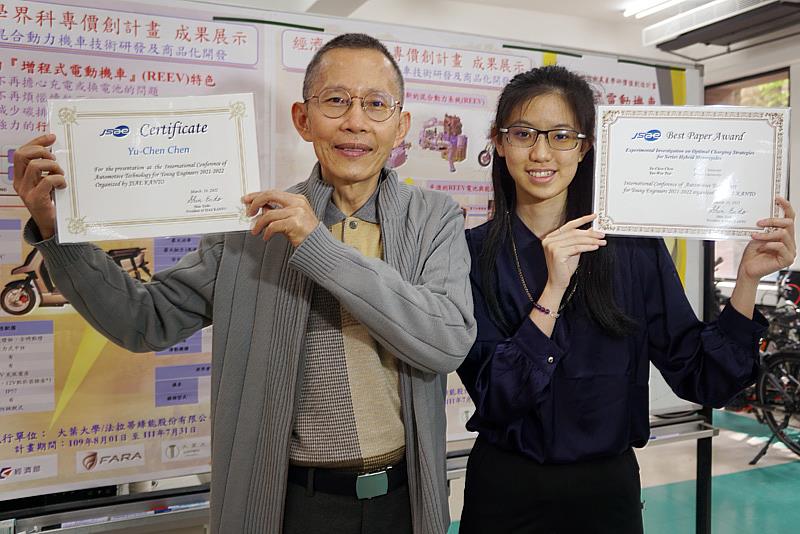 (中央社訊息服務20220421 15:07:22)大葉大學〈Da-Yeh University〉機械與自動化工程學系大四生陳昱臻研究串聯式混合動力機車的電池充電機制,相關論文於日本「JSAE車輛技術國際研討會」(2021-2022 JSAE Kanto ICATYE)線上發表,獲評為最佳論文獎(Best Paper Award)。