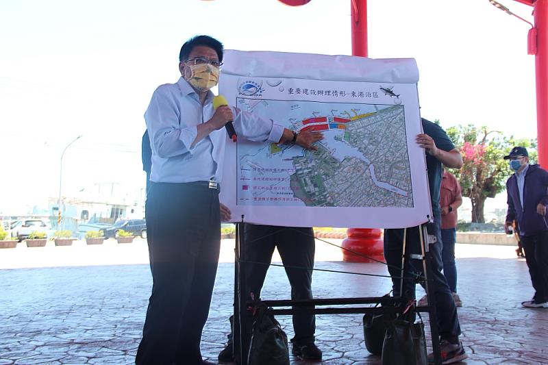 東港鹽埔漁港東港泊區深水碼頭整建工程係於108年經蘇貞昌院長指示辦理,漁業署隨即展開相關漁業設施建設工程,至110年已投入5.3億元。目前深水碼頭改建工程、南內堤縮短研議案、櫻花蝦拍賣場工程、豐漁橋芳都橋間清淤工程、鹽埔泊區佔用排除工作都已經完成,鹽埔泊區停車場工程及鹽埔泊區曳船道工程也將完工,鹽埔漁港道路進度約為40%。