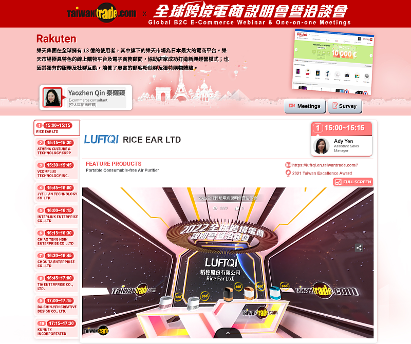 同時,此次說明會後更安排平臺與我商進行交流,除上述平臺外,另有巴西前三大電商集團Via及泰國當地第三大電商平臺JD Central加入,與廠商進行一對一視訊洽談,活動吸引包括石城實業(三點一刻)、昆豪、紅布朗、Dr.Wu、森田藥妝等知名業者報名,總計超過185家廠商參加。