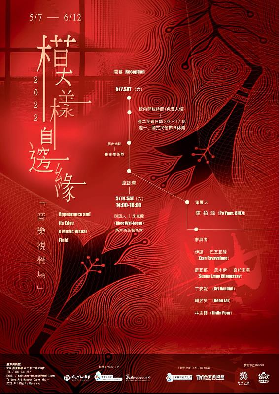 (中央社訊息服務20220503 11:52:34)臺東美術館將於111年5月7日至6月12日展出「模樣邊緣-音樂視覺場」,並訂於7日(星期六)下午2點舉辦開幕式。由策展人陳柏源邀請5位來自不同領域的藝術創作者,在共享音樂的從事經驗底下,透過視覺跟音樂性之創作串連族群文化之間的認識、對話、探討與連結,共同呈現一個音樂與視覺文化計畫「模樣邊緣-音樂視覺場」,歡迎熱愛藝術的人士前來欣賞,並請注意自身的防疫保健。