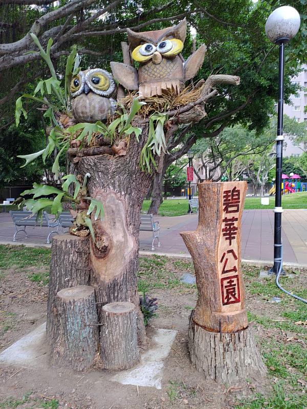 三重區公所及碧華里長林佳鴻一起用心維護公園環境,特別邀請宜蘭國立傳統藝術中心駐園藝師吳俊毅為碧華公園量身製作。以樹根為基座,樹幹為牌匾。由吳俊毅以陽刻手法雕出「碧華公園」。旁邊則利用樹幹及樹枝做成「生命之樹」,在樹幹中間挖洞種植鹿角蕨,周邊也種植多株的鹿角蕨,樹上可愛的2隻Q版領角鴞(台灣特有亞種),取其bo !bo !bo !(布!布!布!)的叫聲及恩愛夫妻的形象做為作品的主體。其中1隻特以台灣麻布(經防水及強化處理)製作,呼應碧華公園以「布」為主題之意象,同時也讓原本的枯木以充滿生命力的型態佇立公園內。