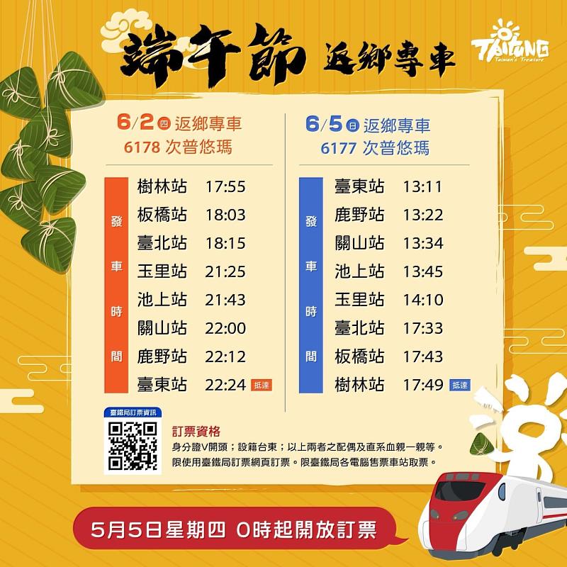 臺東縣政府表示,111年端午節返鄉專車票於臺鐵購票系統之銷售時間於5日0時開放訂票,另於開賣當日9時開放臺鐵局各電腦售票車站現場購票。此次返鄉專車臺鐵將提供樹林到臺東1列車次,以及端午節後的返工專車臺東到樹林1列車次,每列車366座位。返鄉專車(樹林至臺東)為6月2日17:55普悠瑪6178車次;返工專車(臺東至樹林)為6月5日13:11普悠瑪6177車次。