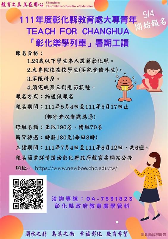111年度彰化縣「Teach for Changhua彰化樂學列車」大專生暑期工讀計畫