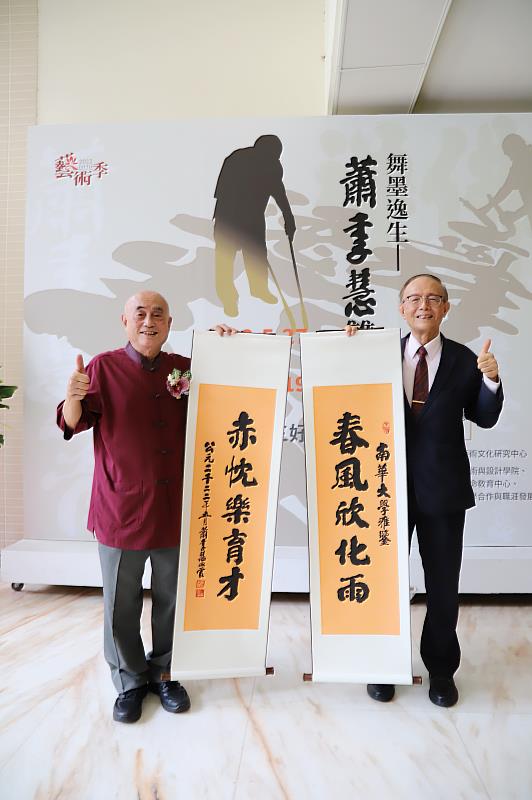 南華大學校長林聰明表示,知名書法家蕭季慧先生歷任新竹市警察局局長、高雄市警察局副局長、高雄市消防局局長,現任蕭季慧雙管書法館館長、臺灣中國書法學會諮詢委員、顏真卿書法學會常務監事。自幼研習書法,迄今近八十年,雙管揮毫達到爐火純青,不論是楷書、行書、草書及榜書各種字體皆運用自如,豪邁的書法作品充滿強烈的生命力,在此次展出的70幅作品中,可以感受到藝術家對於書法創作的熱愛。其書法才華聲名遠播,經常受邀赴國內外各地舉辦作品展覽或做現場揮毫,至今行進二十餘國及大陸地區七十多處城市。榮獲全球中華文化藝術薪傳獎、文馨獎、日本文化振興會「國際文化功勞賞」,並獲美國西太平洋大學「藝術學名譽博士」學位。