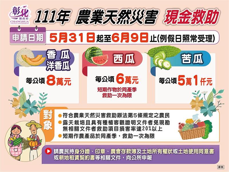 彰化縣為辦理西瓜、香瓜、洋香瓜、苦瓜、胡(芝)麻、百香果、青蔥、冬瓜、南瓜及結球白菜111年5月下旬豪雨農業天然災害現金救助及低利貸款地區