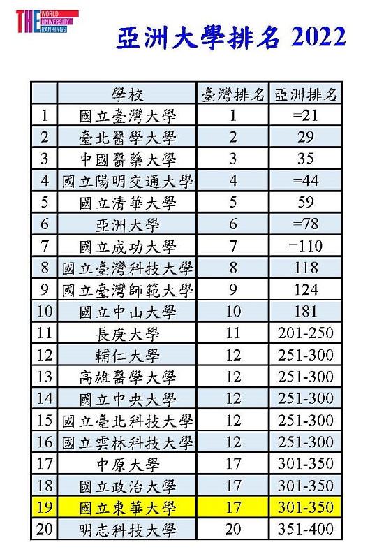 (中央社訊息服務20220603 17:41:19)2022「泰晤士報高等教育專刊」(Times Higher Education,THE)亞洲大學排名於6月1日揭曉,臺灣42所大學入榜,國立東華大學在臺灣排名並列17,在亞洲排名第301-350名。本次參與排名來自亞洲31個地區,計有616所大學,各校需參加世界大學排名,才能參與亞洲大學排名。