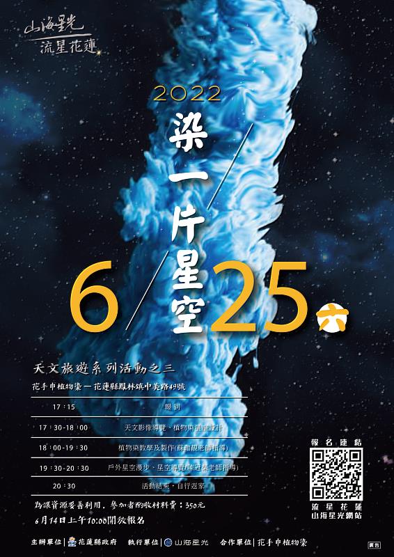 (中央社訊息服務20220609 14:25:28)花蓮縣政府將於6月25日舉行「流星花蓮-山海星光」天文旅遊系列活動三-「染一片星空」星空植物染手作體驗活動,將於6月14日上午10點開放報名,本次活動將鳳林的客家花布、染巾的特色傳統手藝,結合花蓮天文的美景與知識,創造星空植物染手作體驗,活動內容天文星空漫步導覽、植物染星座設計、植物染教學,以及製作獨一無二的星空手提袋。
