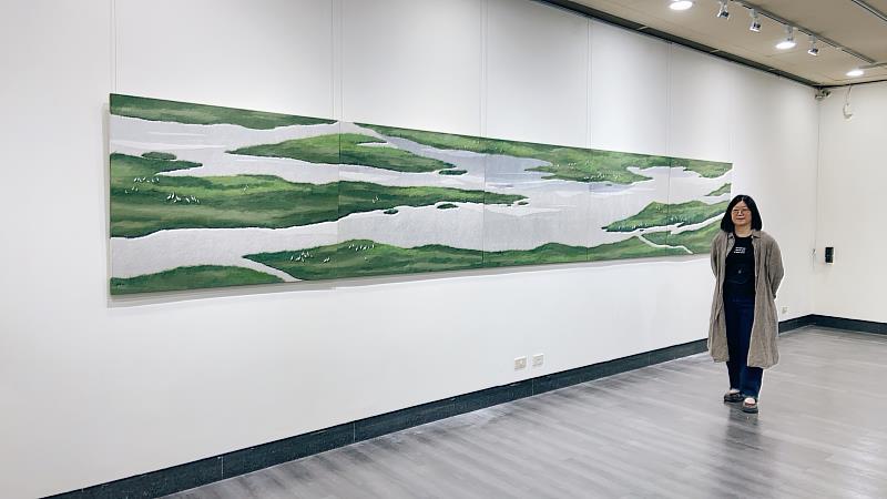 藝術家謝淑慧表示,本次展出46件作品,以四季變化為主題選用不同的材質和技法,將四季美景栩栩如生呈現,其中〈河畔青青〉使用染色棉紙拼貼青青草原,以銀箔表現河流的波光,陽光的照射讓河流的光影充滿朝氣,草原上的白鷺鷥悠閒地漫步,是使用長纖維楮皮紙的特性表現出的質感。