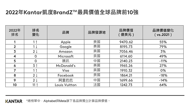 (中央社訊息服務20220616 13:55:25)全球品牌數據分析公司凱度集團於2022年6月15日,最新發佈2022年凱度BrandZ™最具價值全球品牌排行榜。蘋果以9471億美元的品牌價值重回榜首,並有望成為第一個突破萬億美元大關的品牌。Apple在硬體、軟體和服務領域上不斷拓展業務組合,實現了品牌的高度差異化。Google是今年排名上升最快的品牌之一,品牌價值上漲79%至8196億美元,攀升至第二位。Google推出的一系列工作與生產力應用程式已經使其成為全球消費者生活中不可或缺的一部分。