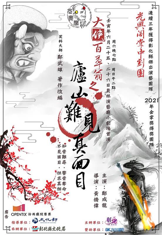 光興閣掌中劇團為縣內第一個進劇場售票演出的布袋戲團隊,第一代團長鄭武雄先生師承二百年歷史的西螺新興閣劇團,將要角「大俠百草翁」獨自發展出笑料大師鄭武雄式風格創作,奠定其布袋戲黃金時代的重要代表人物。接手的第二代團長鄭成龍(本名:林宏憲),致力延續老團長的劇本精華,近年來融合現代劇場專業多媒體聲光技術與時俱進,獲選文化部、國家藝術基金會、國立傳統藝術中心等多項計畫補助,本次演出以經典主角—大俠百草翁為主軸,演出劇目《大俠百草翁之廬山難見真面目》邀請資深布袋戲演師—黃僑偉擔任駐團導演,藉由劇情鋪陳,將金光布袋戲推向高峰,帶領觀眾回味金光布袋戲的輝煌。敬邀鄉親們於111年6月25日晚上7時及6月26日下午2時,一起進劇場欣賞百草翁及各路要角廬山難見的真相!詳細售票資訊請上OPENTIX兩廳院文化生活售票網 (https://reurl.cc/Xj9Qaj)或於演出當天現場購票,票價為250元及5折敬老票。