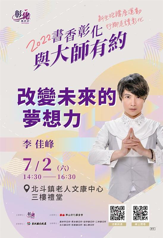 (中央社訊息服務20220621 10:11:09)彰化縣文化局「2022書香彰化-與大師有約」專題講座,以更寬廣豐富的內容,為新生活注入活力滿滿的講座運動,邀您跟著大師的腳步,行腳走讀彰化!第7場次訂於7月2日(星期六)下午2:30在北斗鎮老人文康中心三樓禮堂,邀請亞洲金牌魔術師—李佳峰,以「改變未來的夢想力」為題,分享他朝著夢想前進的心路故事,現場還有絢麗的魔術秀,內容精彩,歡迎參加。