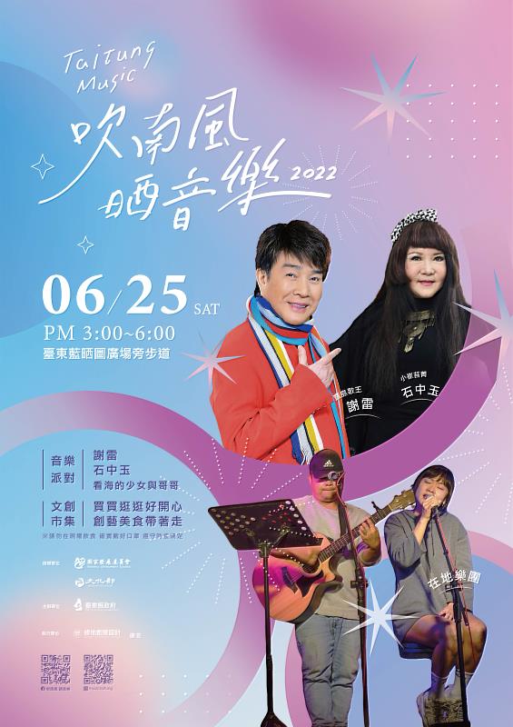 (中央社訊息服務20220623 17:38:10)頗受民眾歡迎、臺東縣政府文化處舉辦多年的「2022吹南風 晒音樂」,第3場系列活動即將在6月25日(星期六)下午3點至6點登場,金曲歌王謝雷、妖姬歌后石中玉將現身臺東藍晒圖廣場旁步道(臺東故事館後方)熱情開唱,兩位豐富的舞台經驗,將陪伴民眾度過歡笑十足的午後時光,喜歡他們的朋友千萬不能錯過,目前仍為疫情期間,文化處提醒參加的民眾落實防疫相關措施。