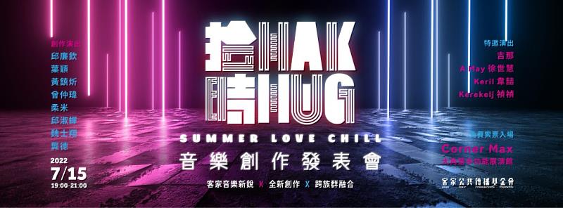 由客家公共傳播基金會舉辦的客家夏日演唱會「拾Hak 時Hug」,本月15日星期五晚上將在台北市Corner Max 大角落多功能展演館演出,客傳會以「出去尞」為主題集結邱廉欽、黃鎮炘、曾仲瑋、邱淑蟬、葉穎、柔米、魏士翔與龔德等歌手演唱客家歌曲,並特別邀請到金曲獎最佳客語歌手吉那-楊淑喻、今年入圍金曲獎最佳客語歌手的徐世慧、排灣族歌手 Kerekelj 禎禎,以及聖露西亞歌手 Keril 韋喆,一同以客語跨界的方式演唱,希望顛覆大家對客家音樂的想像!
