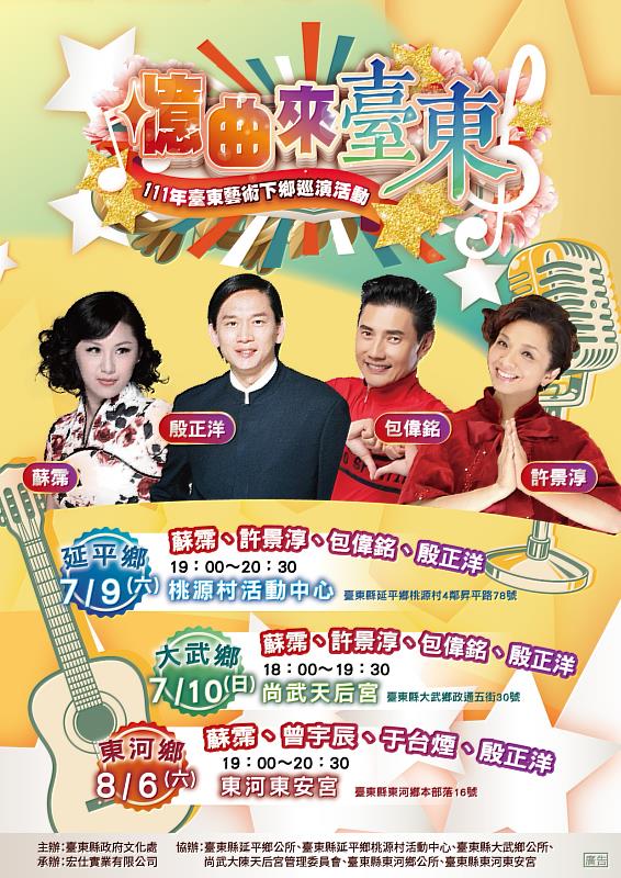 文化處指出,9日首場將於晚間7點至8點30分在延平鄉桃源村活動中心辦理,包偉銘、蘇霈、殷正洋、許景淳將到場與鄉親們同樂,第2場於10日晚間6點至7點30分在大武鄉尚武天后宮舉行,第3場則於8月6日晚間7點至8點30分開拔東海岸東河鄉東安宮。