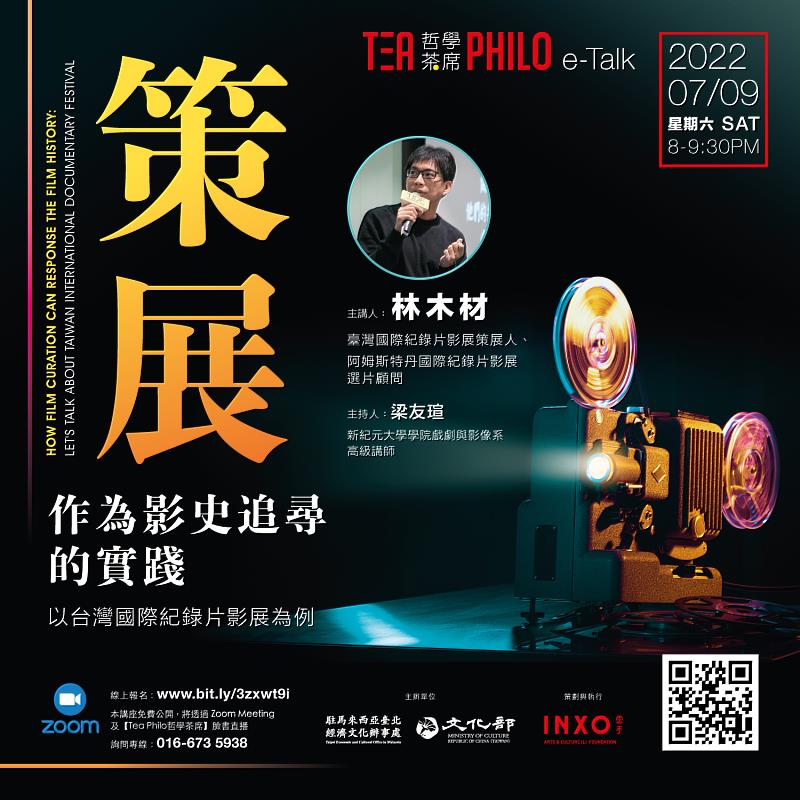 (中央社訊息服務20220708 13:43:47)由駐馬來西亞臺北經濟文化辦事處文化組主辦,雲手文創基金會策劃執行的「Tea Philo 哲學茶席」,將於明(9)日晚間8點邀請台灣國際紀錄片影展(TIDF)策展人林木材,以「策展作為影史追尋的實踐:以台灣國際紀錄片影展為例」為題進行線上講座,分享如何策劃深、廣兼具的影展。