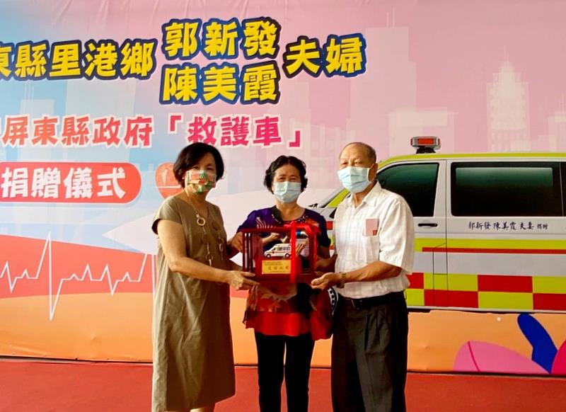 (中央社訊息服務20220708 15:48:40)本縣里港鄉玉田社區長壽會會長郭新發先生及陳美霞女士伉儷捐贈設備精良的福斯救護車一輛,供屏東縣政府消防局里港分隊緊急救護使用,縣府為彰顯郭新發先生的慨捐義舉,特訂於本(111)年07月08日(星期五)辦理贈車典禮,會中由副縣長吳麗雪代表受贈,並回贈感謝狀及紀念品,以表謝忱。