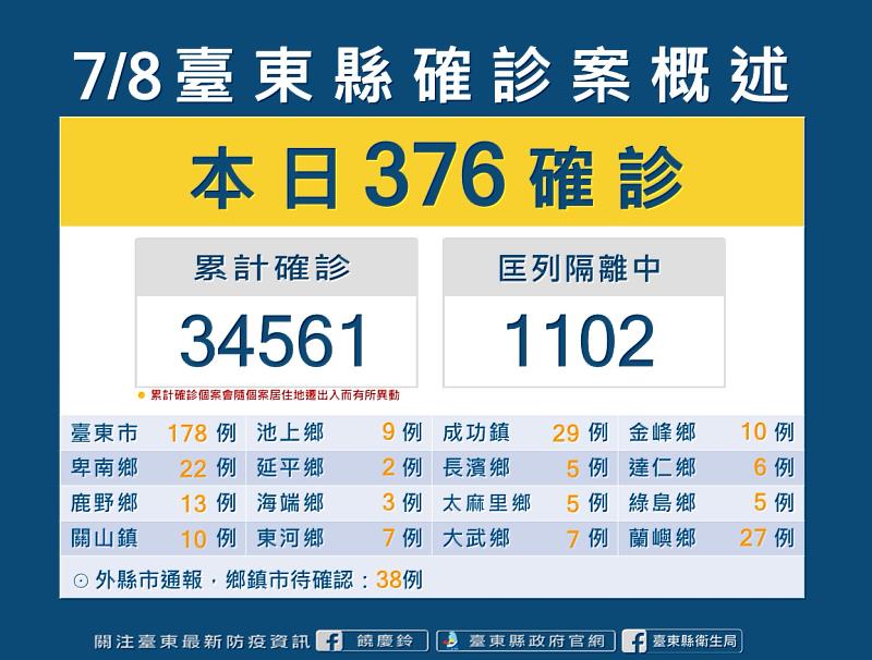 (中央社訊息服務20220708 16:51:54)台東縣今(8)日新增376位確診者,338名民眾戶籍或居住地分在台東、38名為外縣市醫院通報。目前台東縣累計確診個案34561人、居隔者1102人。目前台東針對COVID-19確診者分流收治情況,截至7/7下午16點為止,住院收治人數為49人、加強版集中檢疫所為28人、居家照護現管人數有2517人。