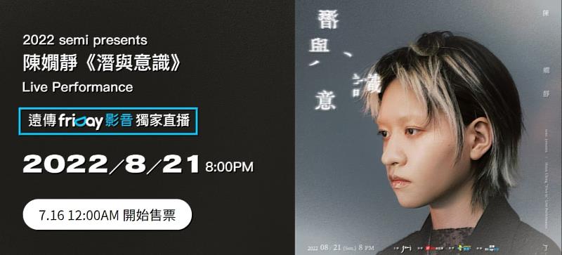 華語歌壇最近有越來越多新生代的歌手嶄露頭角,陳嫺靜是其中受到許多年輕人喜愛的饒舌音樂創作歌手,魔性的嗓音與音樂在獨立音樂圈相當有名,憑藉在數位音樂平台上發行單曲與《Call In計畫》竄紅。暑期期間,陳嫺靜將首次線上Live演出《潛與意識》,遠傳與製作團隊 semi 合作,將在遠傳friDay影音獨家直播,遠傳心生活會員更可獨享購票優惠。