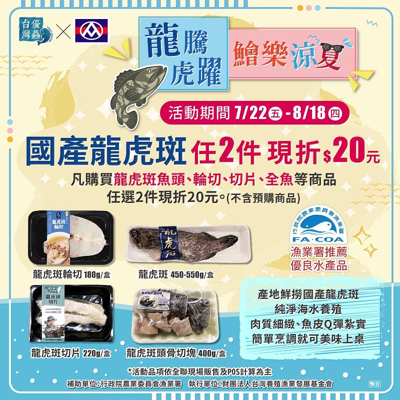 (中央社訊息服務20220722 09:24:30)炎夏來襲,酷熱暑氣使人體水分快速流失、體力消耗快,為推廣民眾均衡飲食、健康食魚,漁業署輔導財團法人養殖漁業發展基金會與全聯福利中心攜手合作推出「龍騰虎躍 鱠樂涼夏」檔期促銷活動,自即日起至8月18日止,消費者到全臺全聯門市購買產地新鮮直送「龍虎斑輪切、龍虎斑切片、龍虎斑、龍虎斑魚頭切塊」等系列商品任2件,享結帳金額現折20元(不含預購商品),要讓民眾夏日居家食補,輕鬆享受石斑魚的營養與美味。